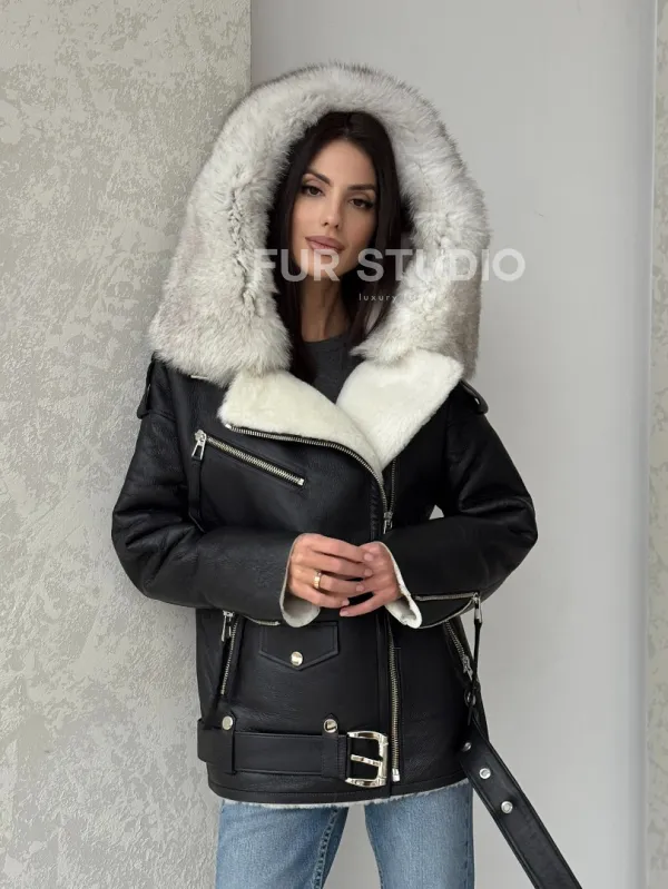 Черная куртка дубленка с капюшоном. Модель предлагается в размерах от 42 до 54. Оптимальная длина моделей 60-65 см подчеркивает линии вашей фигуры. Эта дубленка станет неотъемлемой частью гардероба для тех, кто предпочитает роскошь и утонченность натуральной кожи.