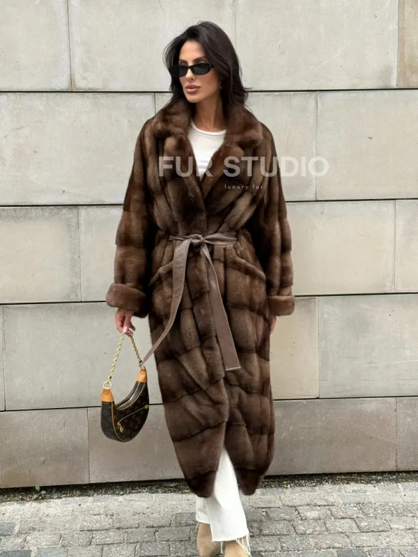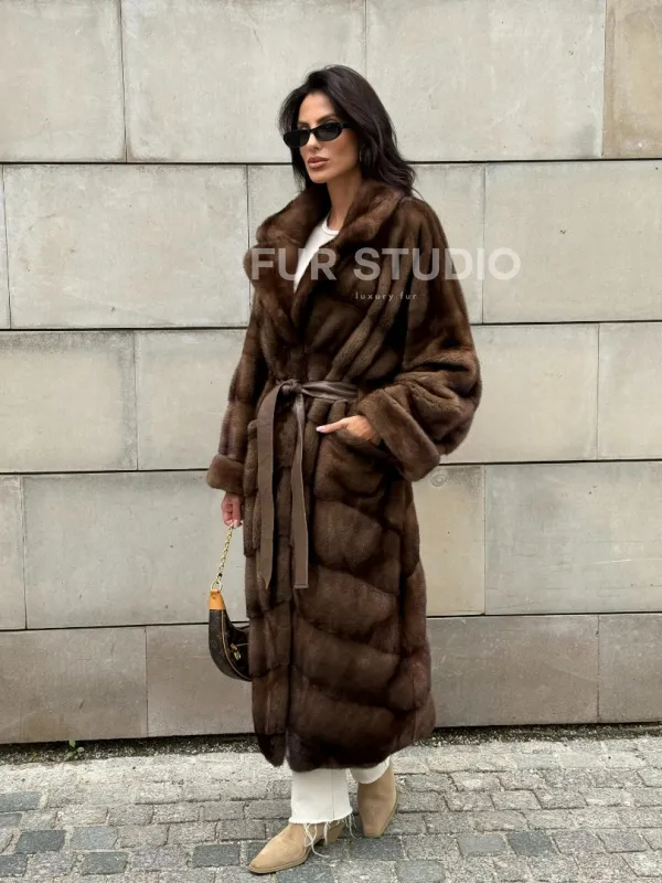 Мех данной шубы аукционная норка, цвет коричневый. Предлагается в размерах от 42 до 50 с 52 до 60 возможен отшив по индивидуальным параметрам. Длина модели 115-120 см, что выгодно подчеркивает фигуру девушек. Эта модель идеально подойдет для девушек и женщин, предпочитающих роскошные натуральные меха.