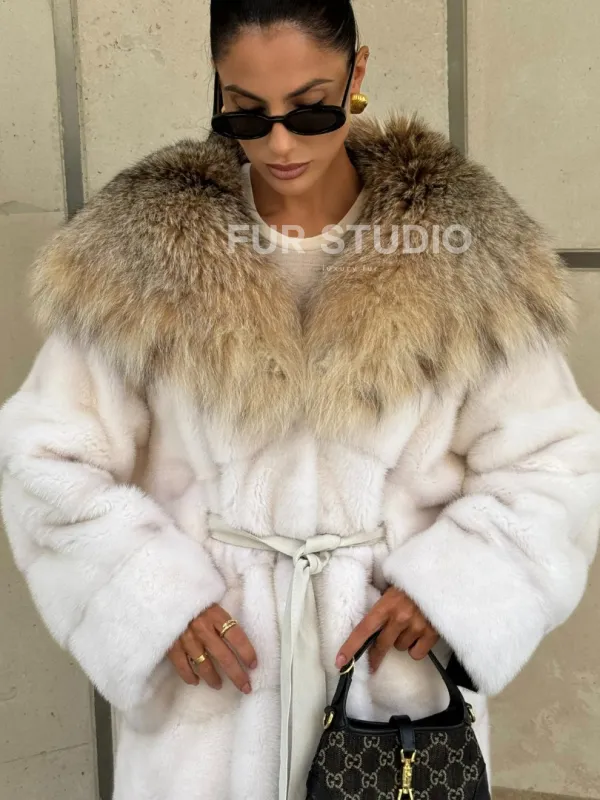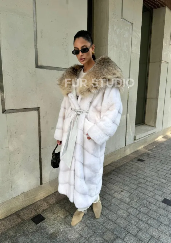Мех данной шубы аукционная норка, цвет белый. Предлагается в размерах от 42 до 54. Длина модели 115-120 см, что выгодно подчеркивает фигуру девушек. Эта модель идеально подойдет для девушек и женщин, предпочитающих роскошные натуральные меха.